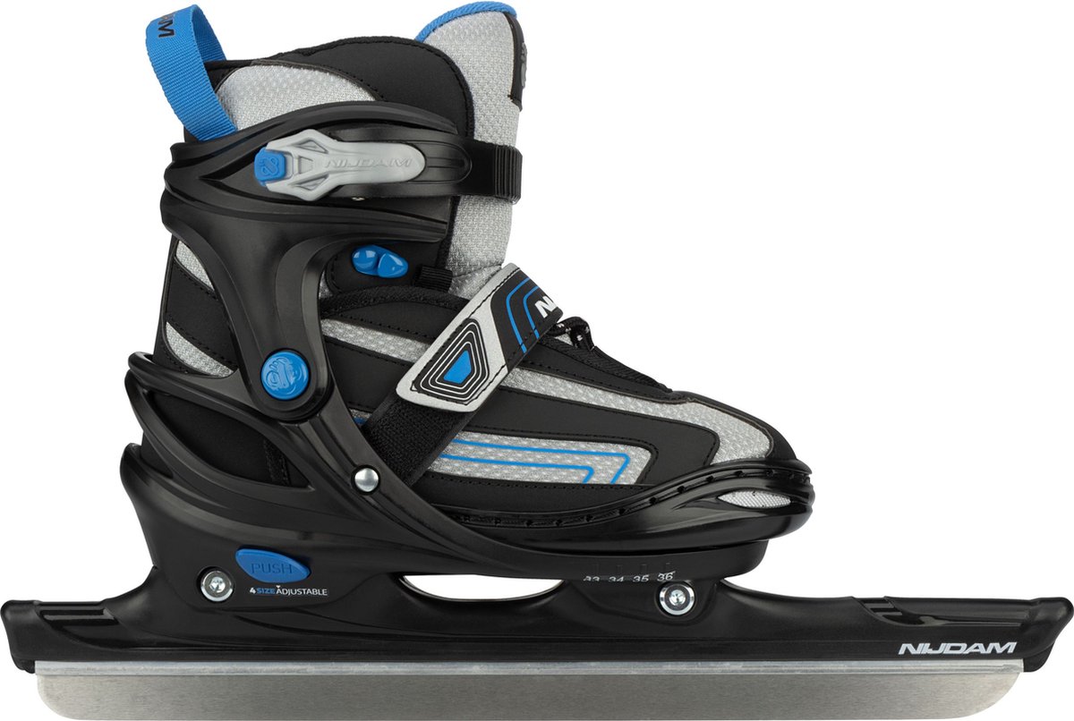 Schaats sneller dan ooit tevoren met de Nijdam Scratch Speeder verstelbare noren. Deze snelle kinderschaatsen zijn perfect voor de jongere snelheidsduivels. Je kunt de schaatsen gemakkelijk in 4 maten verstellen, waardoor ze nog jaren met de voeten mee kunnen groeien. Dankzij het stevige semi-softboot design is deze kindernoor super comfortabel en krijg je niet snel last van zere voeten. De noren kunnen tegen een stootje; ze zijn voorzien van een stevige, schokabsorberende hiel- en teenkap en hebben een high-impact PP schaatshouder. Je kunt de norenschaats gemakkelijk zelf dichtmaken met de klittenband powerstrap, veters en de snelsluiting. De schaats is voorzien van een roestvaststalen norenijzer en stoere blauwe details. Deze noren zijn geschikt voor zowel beginners als gevorderde recreatieve schaatsers en zijn bijvoorbeeld ideaal voor schaatslessen en training.