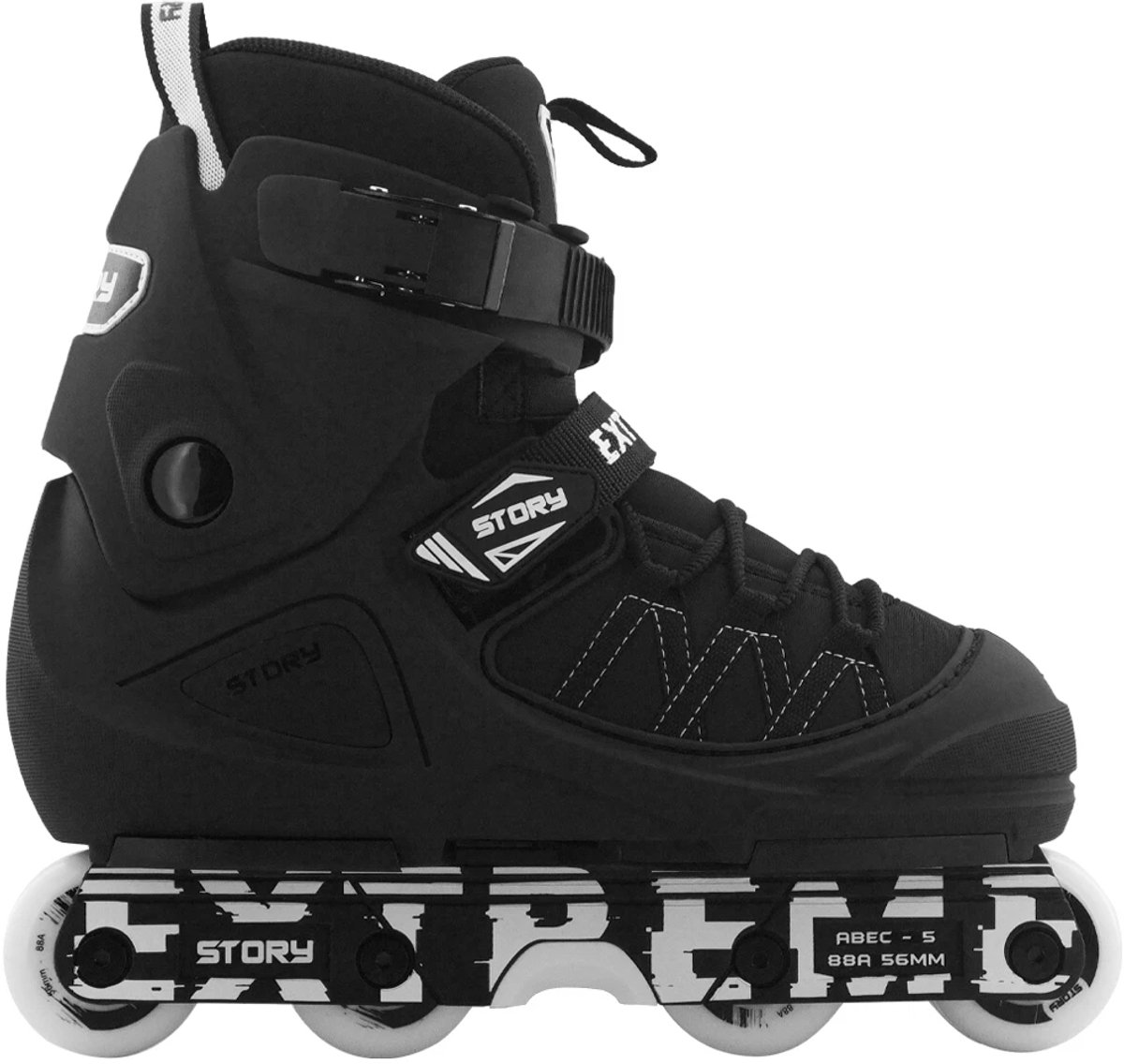 * Type skate: Aggressive inline * Frame: Verstevigd kunststof * Wiel diameter: 56 mm * Wielhardheid: ca. 90A * Lagers: ABEC-5 * Grindplate: Ja * Sluiting: Veters + klittenband * Pasvorm: Normaal tot smal * Kleur: Zwart * Max. belasting: 100 kg * Doelgroep: Beginners tot licht gevorderden Start jouw stuntskate-avontuur met de Story Aggressive Inline Skates Black. Ideaal om veilig te leren grinden, springen en skaten op straat of in het park!