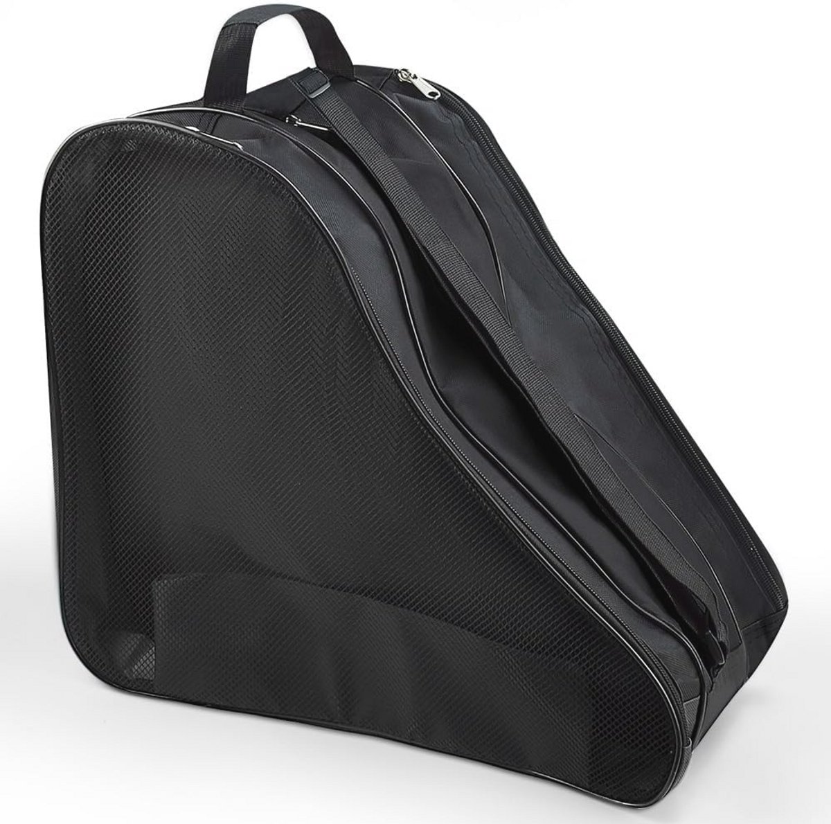 Deze multifunctionele tas is perfect voor het opbergen van schaatsen, beschermingsuitrusting en andere benodigdheden. De ruime tas heeft drie compartimenten en is geschikt voor zowel volwassenen als kinderen. Met afmetingen van 39 x 20 x 20 x 30 cm, biedt hij voldoende ruimte voor schaatsen tot maat 47. Gemaakt van waterdicht Oxford-materiaal, is deze tas duurzaam en eenvoudig te reinigen. Dankzij de verstelbare schouderriem is hij gemakkelijk te vervoeren. Ideaal voor schaatsen, vierwielige en inline skates. Vermijd het opbergen van frames in deze tas.