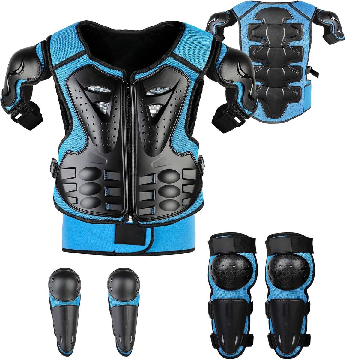 - Uitgebreide bescherming: De set omvat een motorjas, kniebeschermers, elleboogbeschermers en borstpantser voor volledige bescherming tijdens diverse sporten.