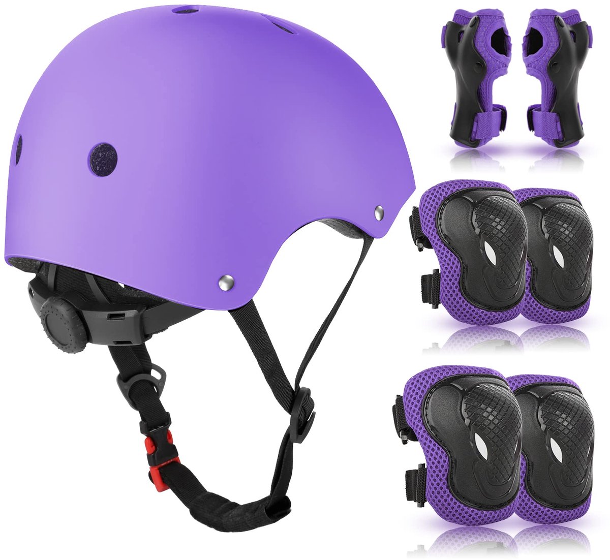 Unyqoos® Deze uitgebreide beschermset is speciaal ontworpen voor jonge avonturiers van 3 tot 10 jaar. Of uw kind nu graag fietst, skateboards, rolschaatst of inlineskates gebruikt, met deze set kan het veilig en vol vertrouwen op pad. De set biedt essentiële bescherming met een helm, kniebeschermers, elleboogbeschermers en polsbeschermers, allemaal uitgevoerd in een aantrekkelijke paarse kleur. Dankzij de verstelbare helm, die geschikt is voor een hoofdomtrek van 48-54 cm, groeit deze set mee met uw kind, waardoor langdurig gebruik mogelijk is.